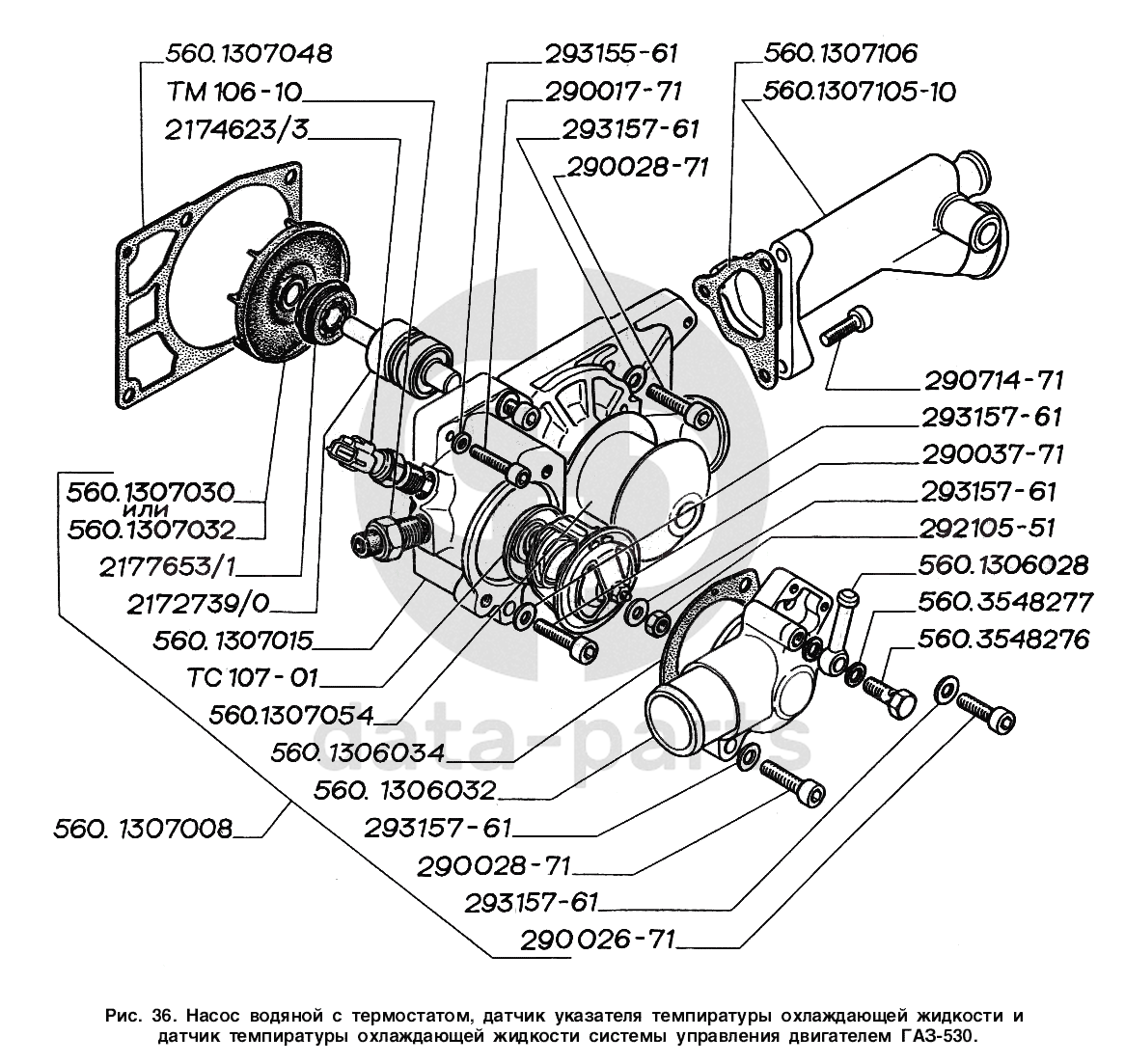 Насос водяной с термостатом, датчик указателя температуры охлаждающей жидкости и датчик температуры охлаждающей жидкости системы управления двигателем ГАЗ-560 ГАЗ-2217 (Соболь)
