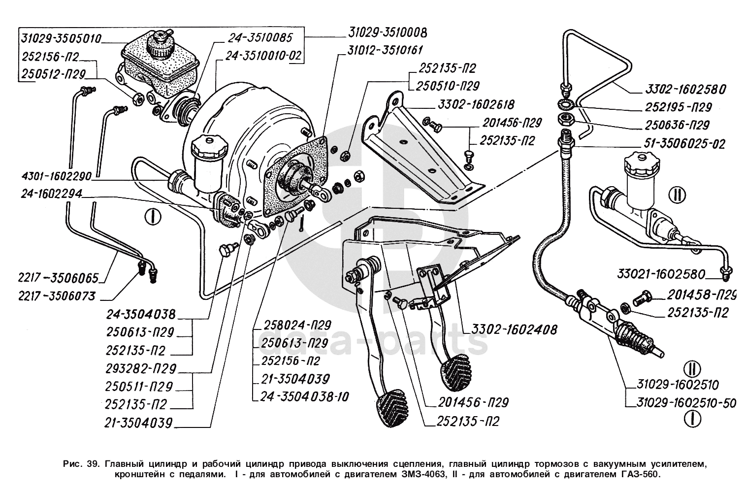 Главный цилиндр и рабочий цилиндр привода выключения сцепления, главный цилиндр тормозов с вакуумным усилителем, кронштейн с педалями: I - для автомобилей с двигателем ЗМЗ-4063, II - для автомобилей с двигателем ГАЗ-560 ГАЗ-2217 (Соболь)