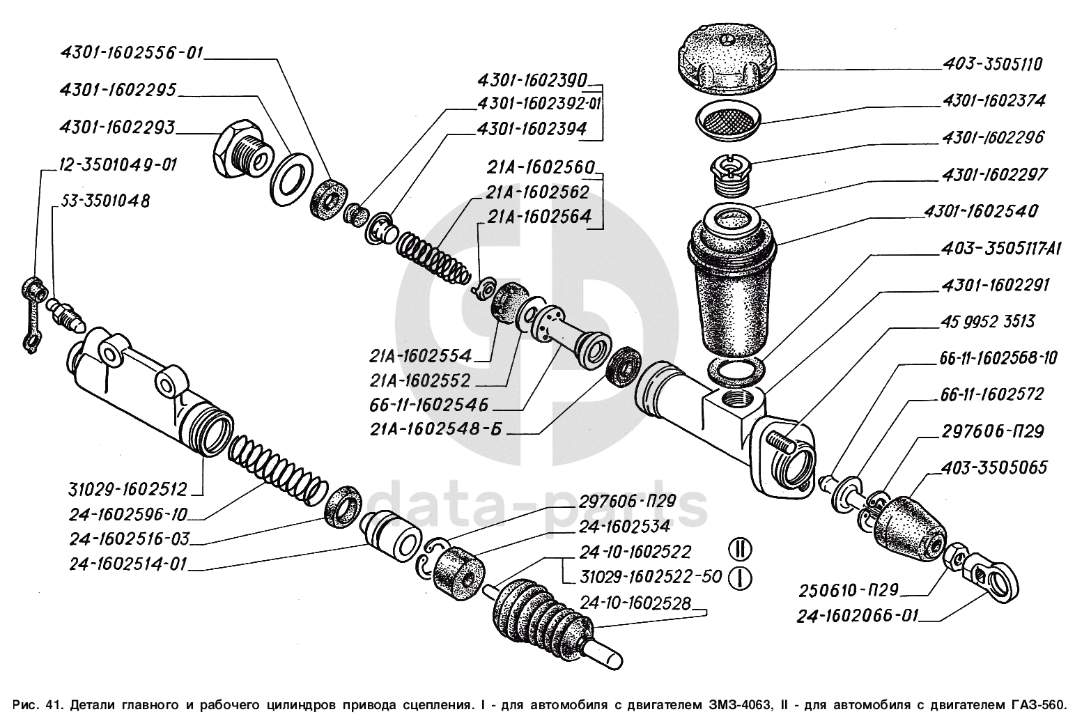 Детали главного и рабочего цилиндров привода выключения сцепления: I - для автомобилей с двигателем ЗМЗ-4063, II - для автомобилей с двигателем ГАЗ-560 ГАЗ-2217 (Соболь)
