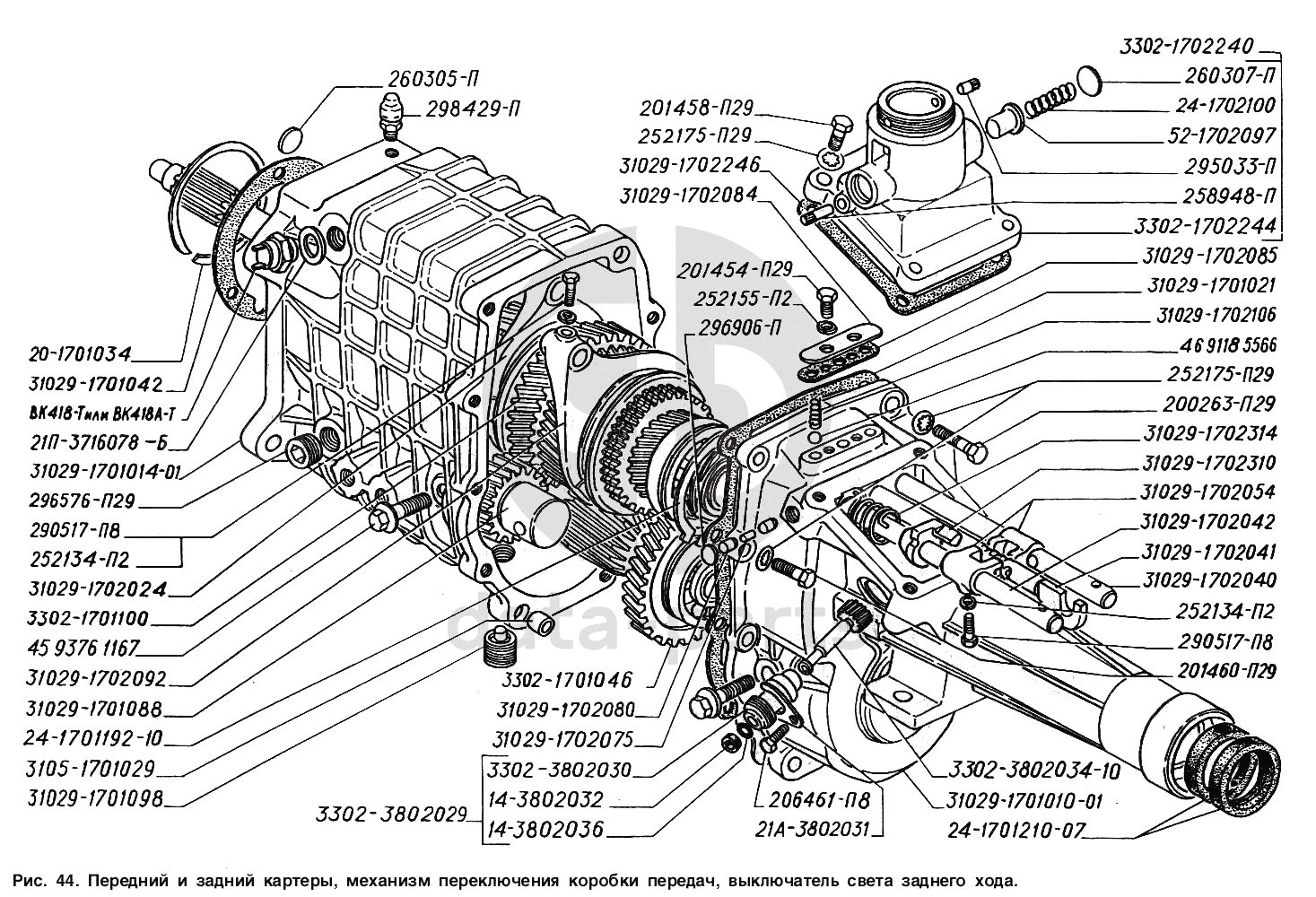 Передний и задний картеры, механизм переключения коробки передач, выключатель света заднего хода ГАЗ-2217 (Соболь)