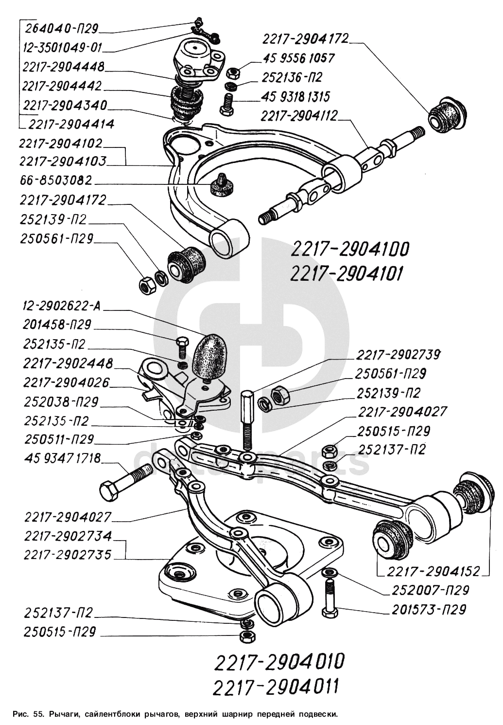 Рычаги, сайлентблоки рычагов, верхний шарнир передней подвески ГАЗ-2217 (Соболь)