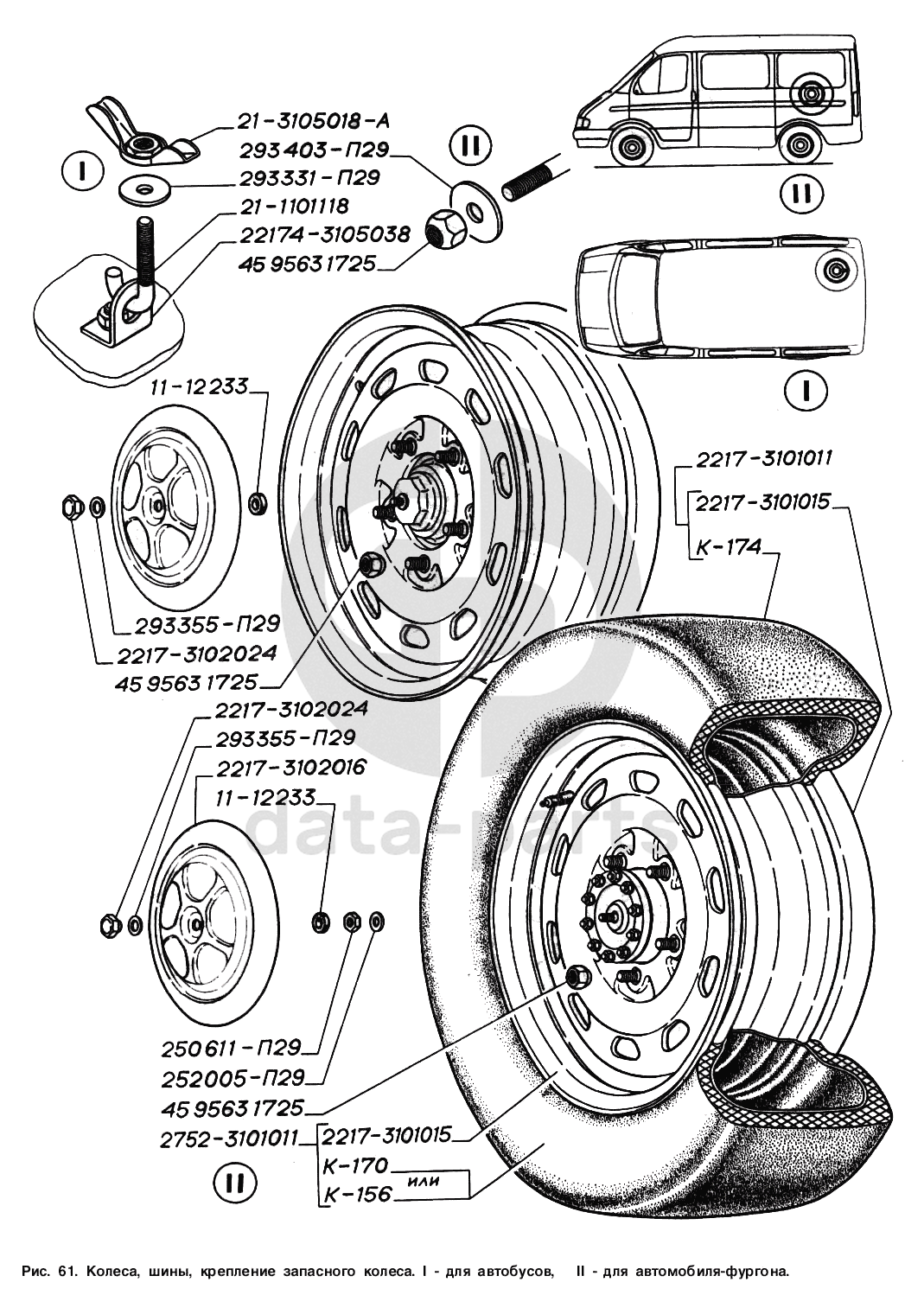 Колеса, шины, крепление запасного колеса: I - для автобусов, II - для автомобиля-фургона ГАЗ-2217 (Соболь)