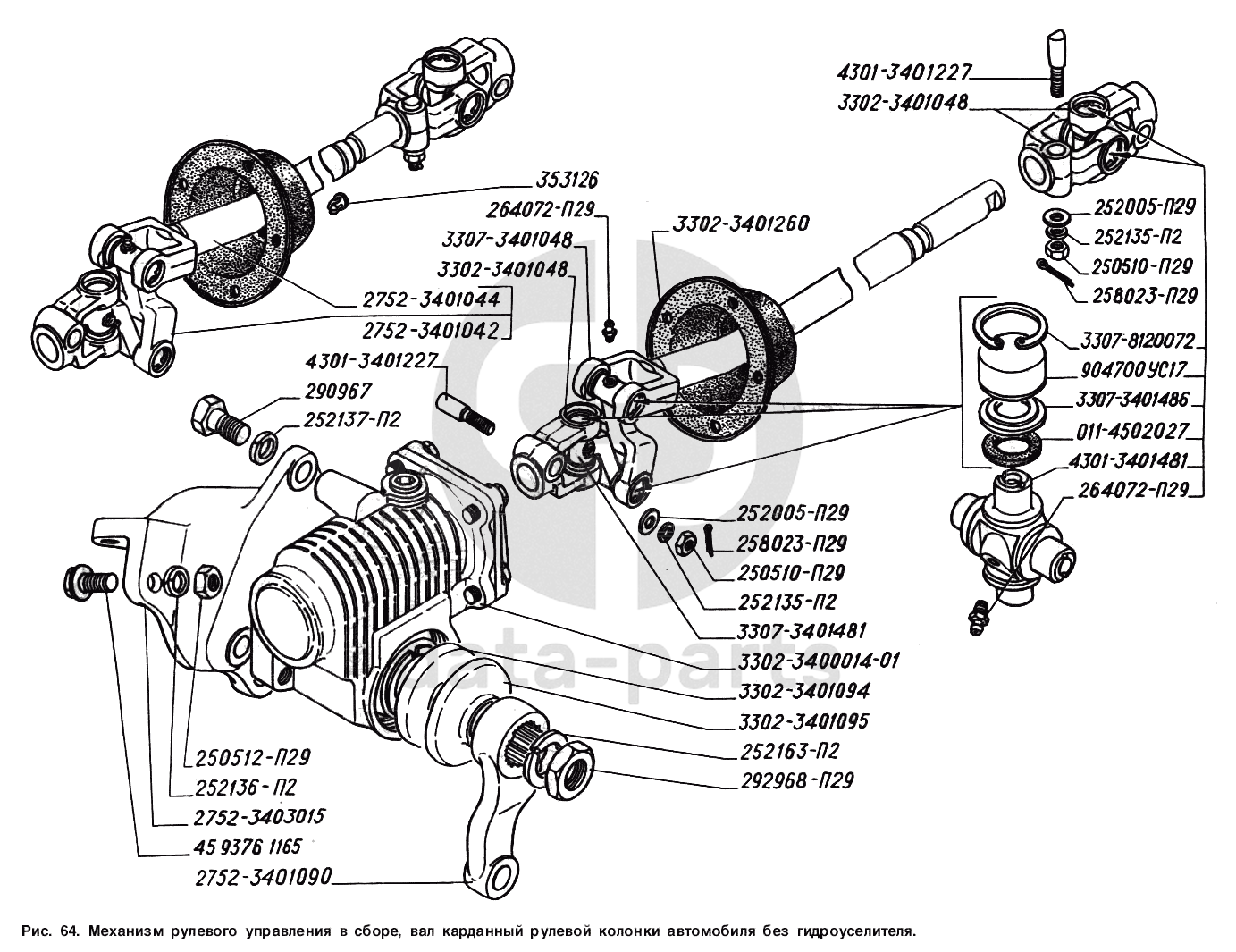 Механизм рулевого управления в сборе, вал карданный рулевой колонки автомобиля без гидроусилителя ГАЗ-2217 (Соболь)