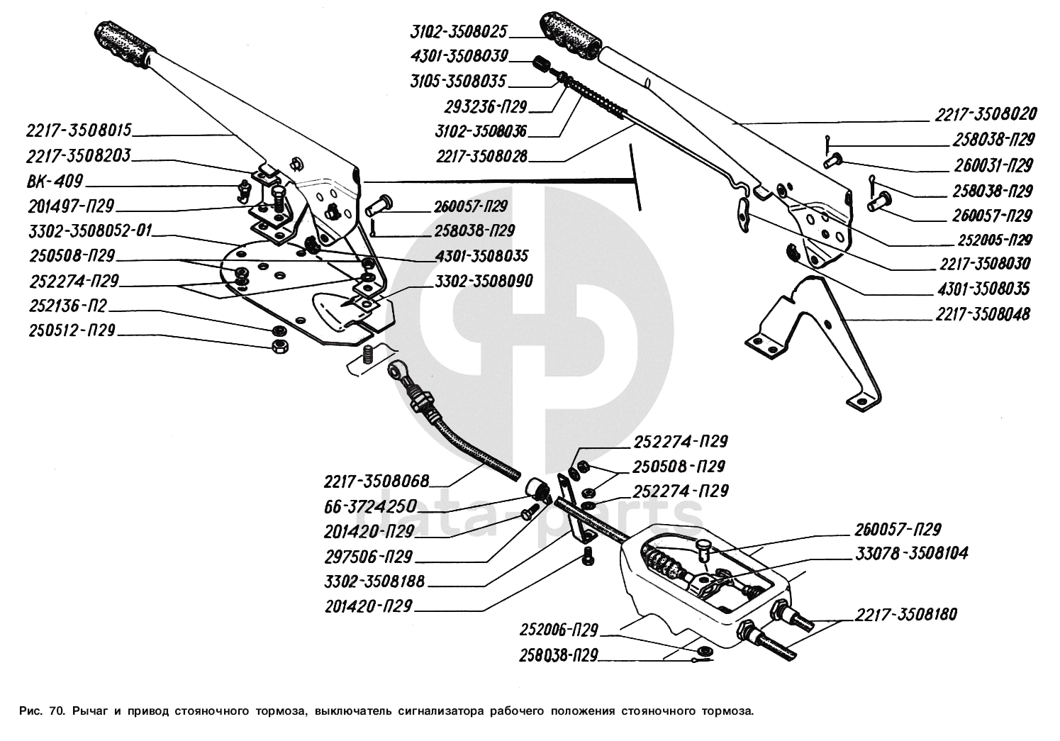 Рычаг и привод стояночного тормоза, выключатель сигнализатора рабочего положения стояночного тормоза ГАЗ-2217 (Соболь)