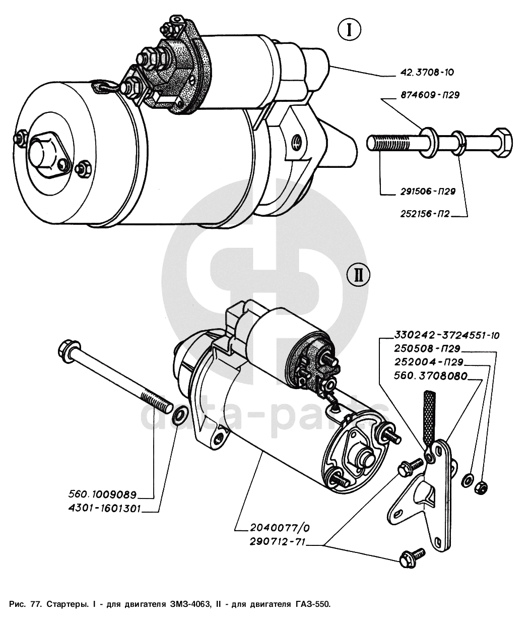 Стартеры: I - для двигателя ЗМЗ-4063, II -для двигателя ГАЗ-560 ГАЗ-2217 (Соболь)