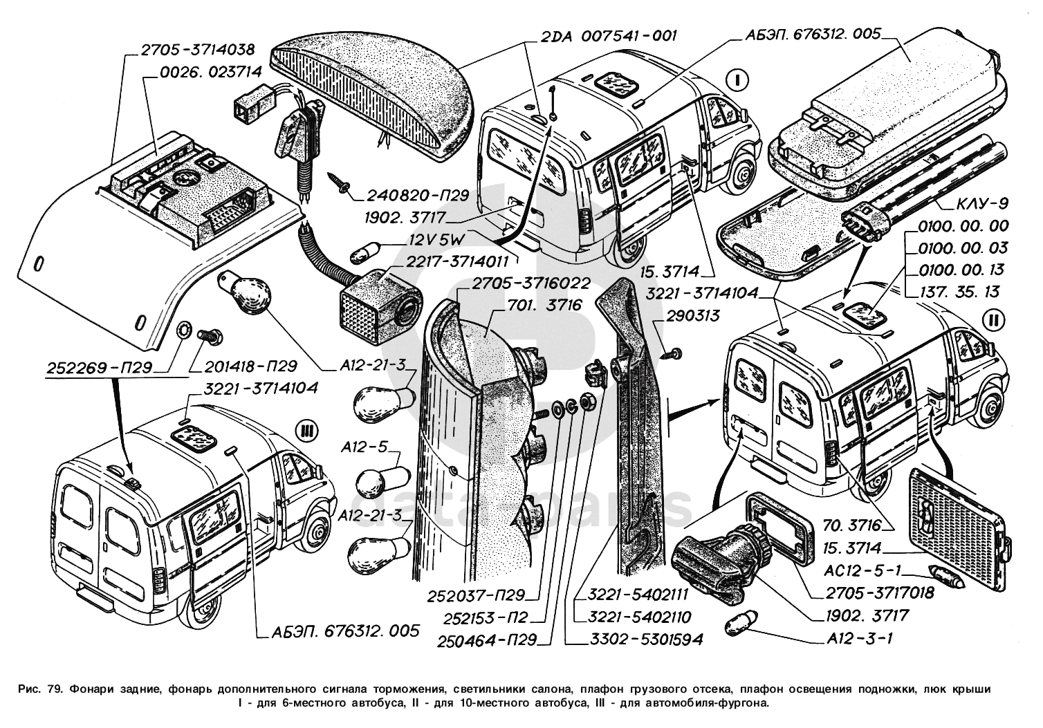 Фонари задние, фонарь дополнительного сигнала торможения, светильники салона, плафон грузового отсека, плафон освещения подножки, люк крыши: I - для 6-и местного автобуса, II - для 10-и местного автобуса, III- для автомобиля-фургона ГАЗ-2217 (Соболь)