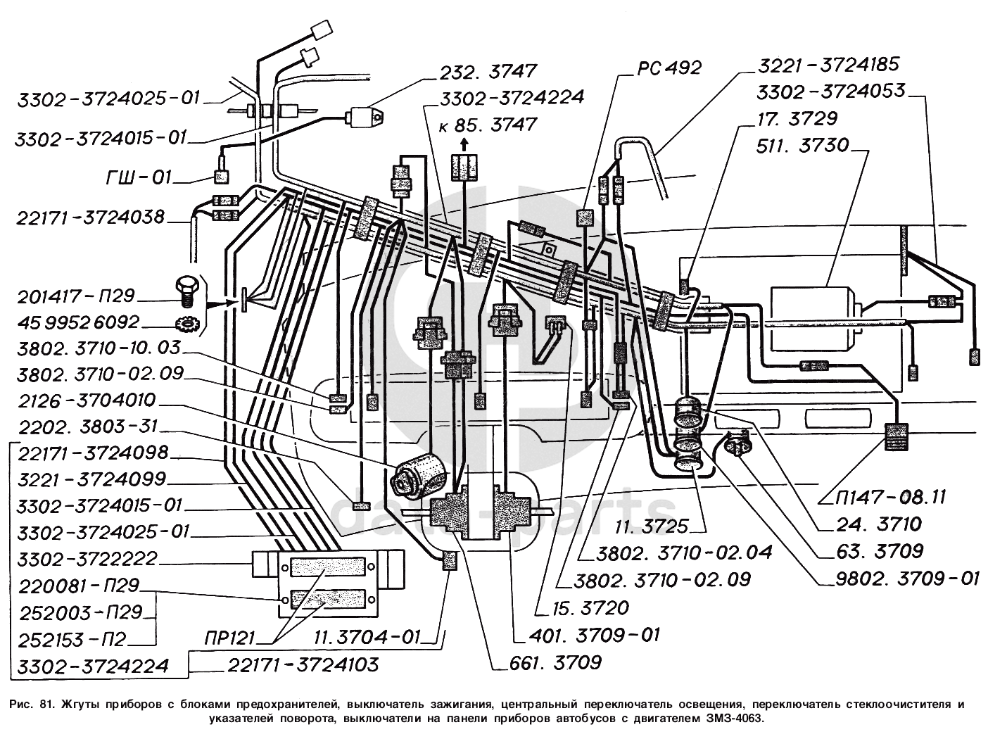 Жгуты проводов с блоками предохранителей, выключатель зажигания, центральный переключатель освещения, переключатель стеклоочистителя и указателей поворота, выключатели на панели приборов автобусов с двигателем ЗМЗ-4063 ГАЗ-2217 (Соболь)