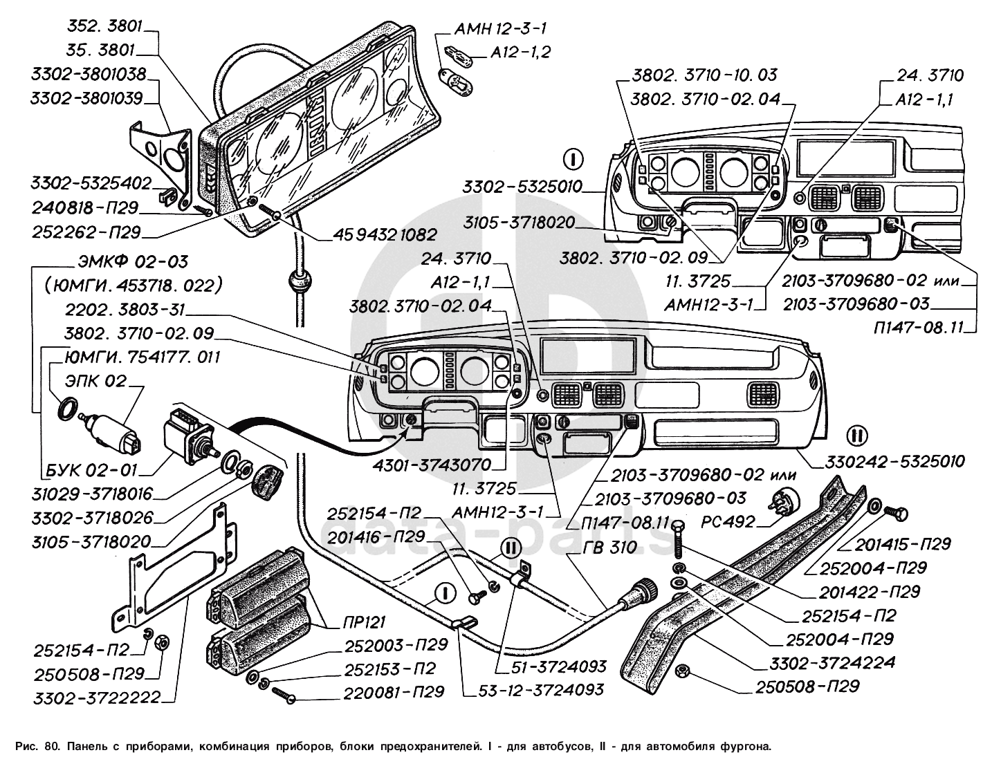 Панель с приборами, комбинация приборов, блоки предохранителей: I - для автобусов, II - для автомобиля-фургона ГАЗ-2217 (Соболь)