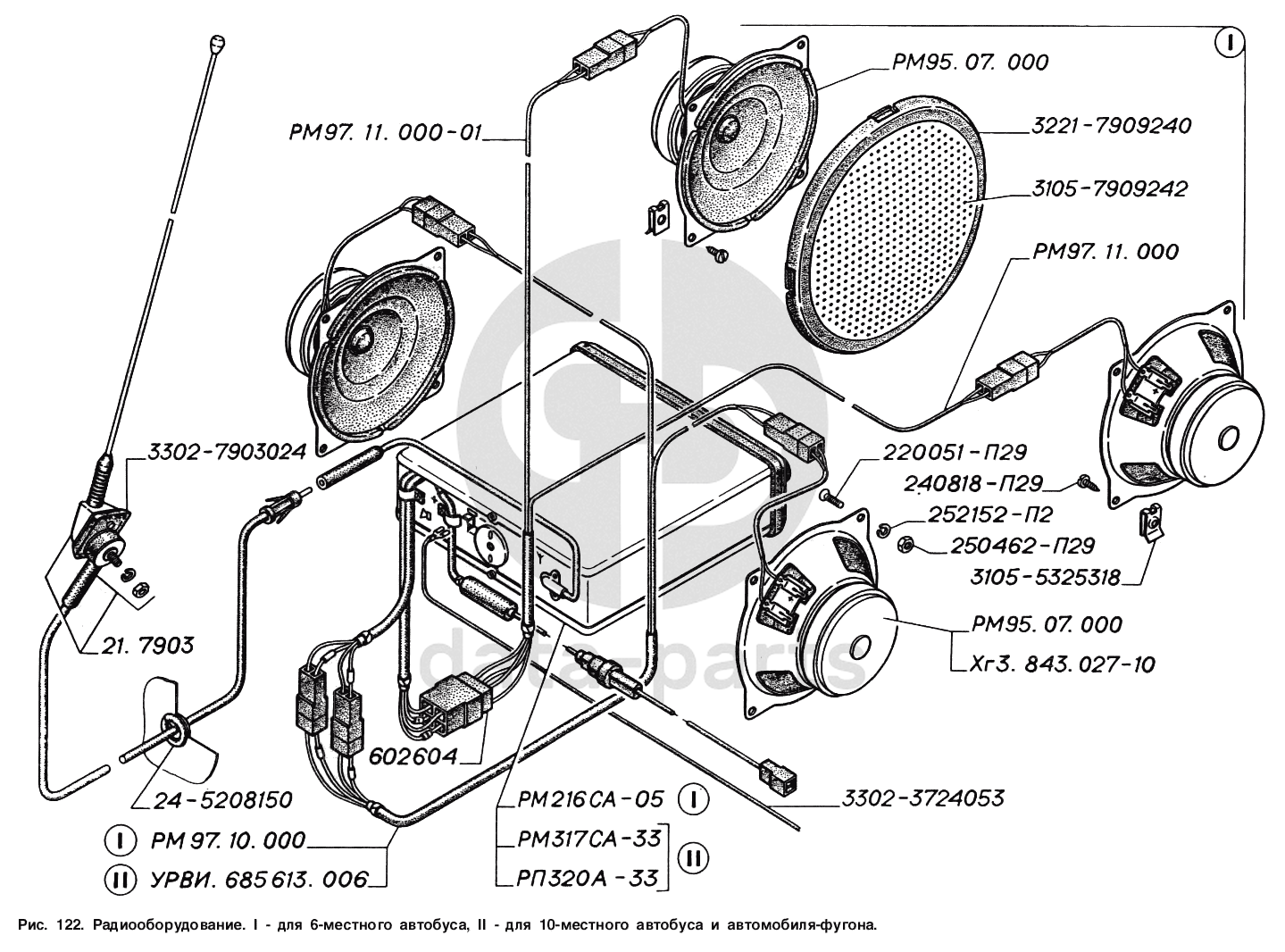 Радиооборудование: I - для 6-местного автобуса, II - для 10-местного автобуса и автомобиля-фургона ГАЗ-2217 (Соболь)