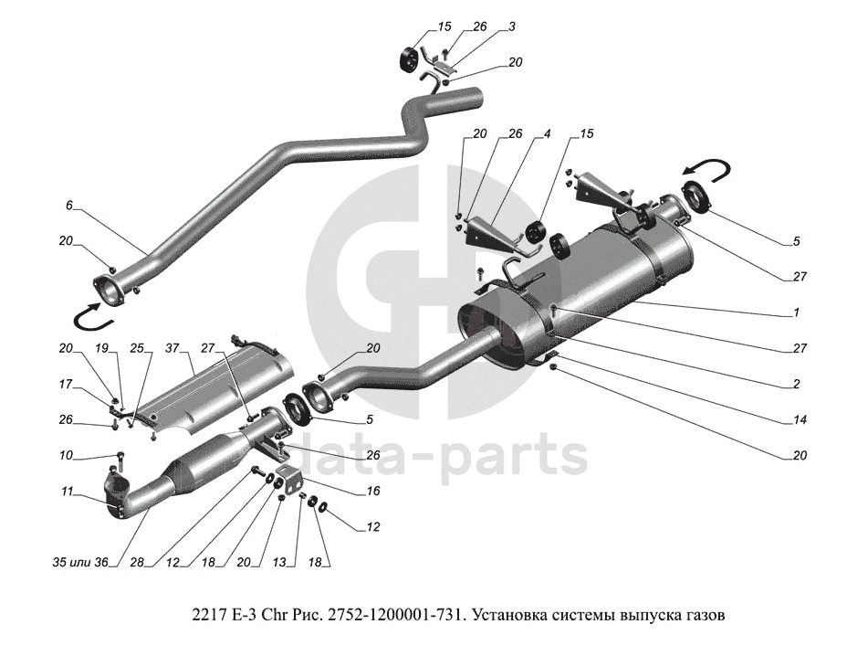 2752-1200001-731.Установка системы выпуска газов ГАЗ-2217 (доп. с дв. Chr Е 3)