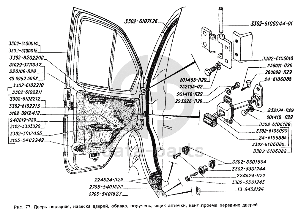 Дверь передняя, навеска дверей, обивка, поручень, ящик аптечки, кант проема передних дверей ГАЗ-2705 (ГАЗель)