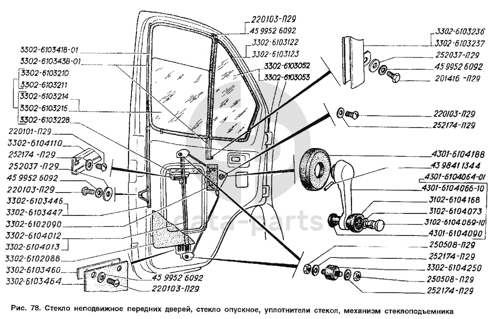 Стекло неподвижное передних дверей, стекло опускное, уплотнители стекол, механизм стеклоподъемника ГАЗ-2705 (ГАЗель)