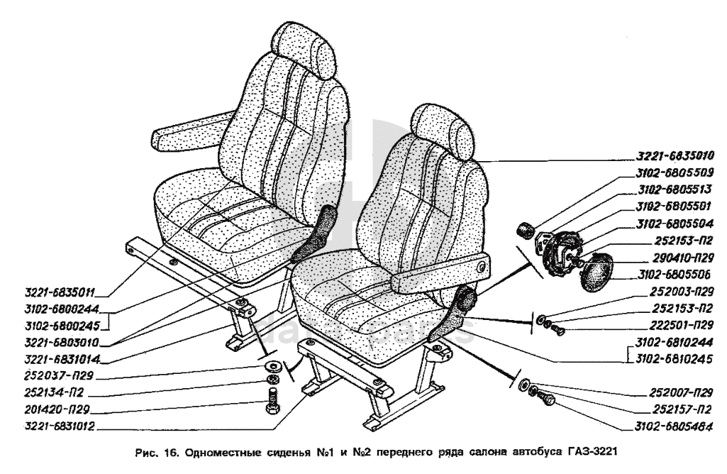 Одноместные сиденья №1 и № 2 переднего ряда салона автобуса ГАЗ-3221 ГАЗ-2705 (ГАЗель)