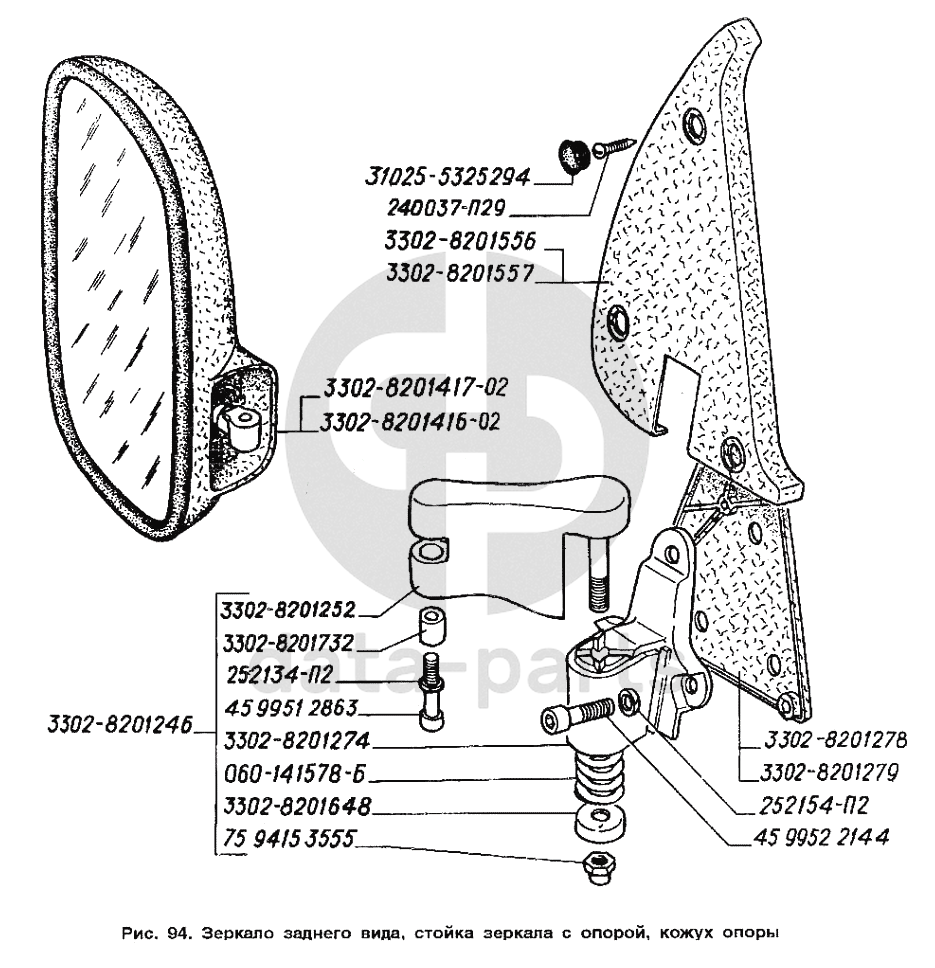 Зеркало заднего вида, стойка зеркала с опорой, кожух опоры ГАЗ-2705 (ГАЗель)
