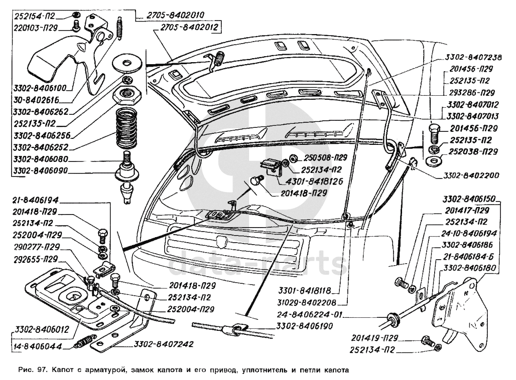 Капот с арматурой, замок капота и его привод, уплотнитель и петли капота ГАЗ-2705 (ГАЗель)