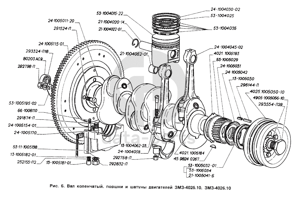 Вал коленчатый, поршни и шатуны двигателей ЗМЗ-4025.10, ЗМЗ-4026.10 ГАЗ-2705 (ГАЗель)