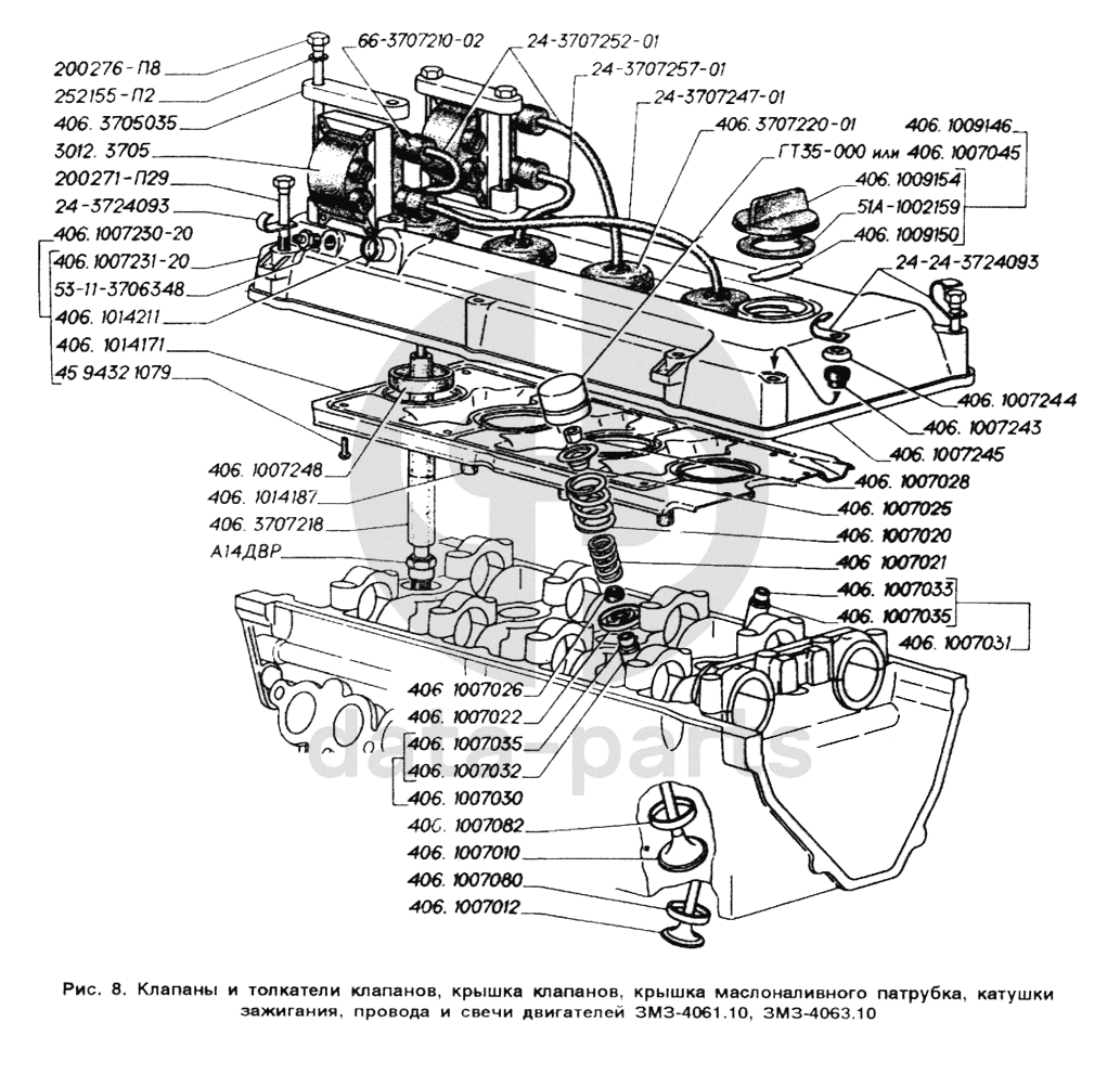 Клапаны и толкатели клапанов, крышка клапанов, крышка маслоналивного патрубка, катушки зажигания, провода и свечи двигателей ЗМЗ-4061.10, ЗМЗ-4063.10 ГАЗ-2705 (ГАЗель)