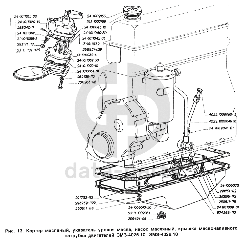 Картер масляный, указатель уровня масла, насос масляный, крышка маслоналивного патрубка двигателей ЗМЗ-4025.10, ЗМЗ-4026.10 ГАЗ-2705 (ГАЗель)