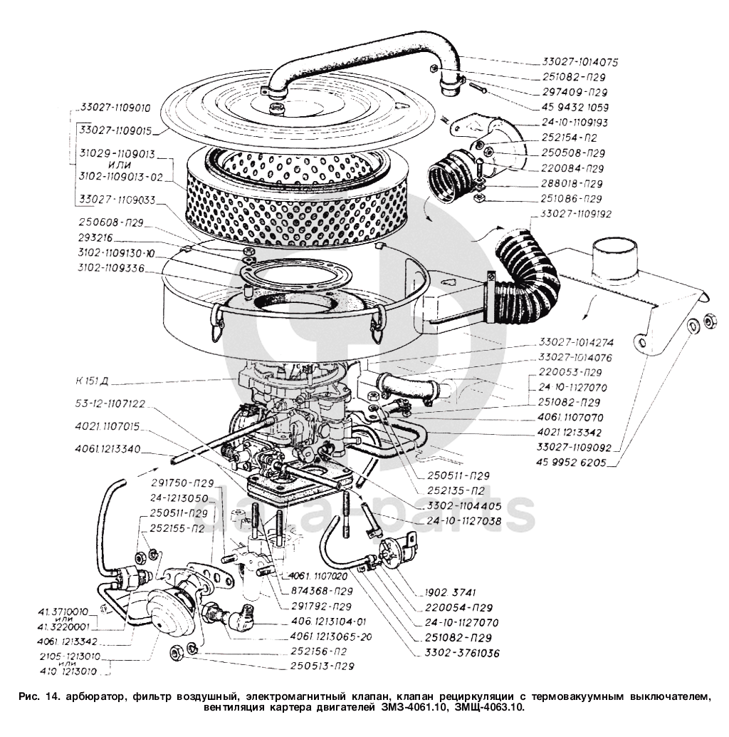 Карбюратор, фильтр воздушный, электромагнитный клапан, клапан рециркуляции с термовакуумным выключателем, вентиляция картера двигателей ЗМЗ-4061.10, ЗМЗ-4063.10 ГАЗ-2705 (ГАЗель)