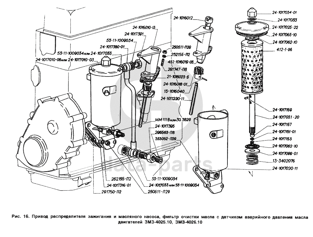 Привод распределителя зажигания и масляного насоса, фильтр очистки масла сдатчиком аварийного давления масла двигателей ЗМЗ-4025.10, ЗМЗ-4026.10 ГАЗ-2705 (ГАЗель)