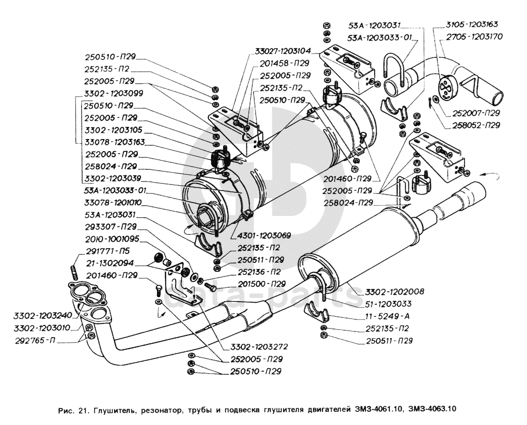 Глушитель, резонатор, трубы и подвеска глушителя двигателей ЗМЗ-4061.10, ЗМЗ-4063.10 ГАЗ-2705 (ГАЗель)