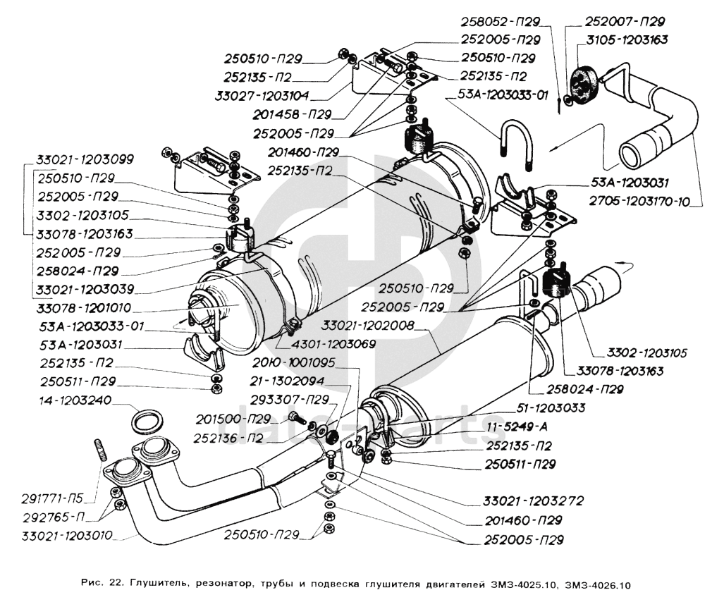 Глушитель, резонатор, трубы и подвеска глушителя двигателей ЗМЗ-4025.10, ЗМЗ-4026.10 ГАЗ-2705 (ГАЗель)
