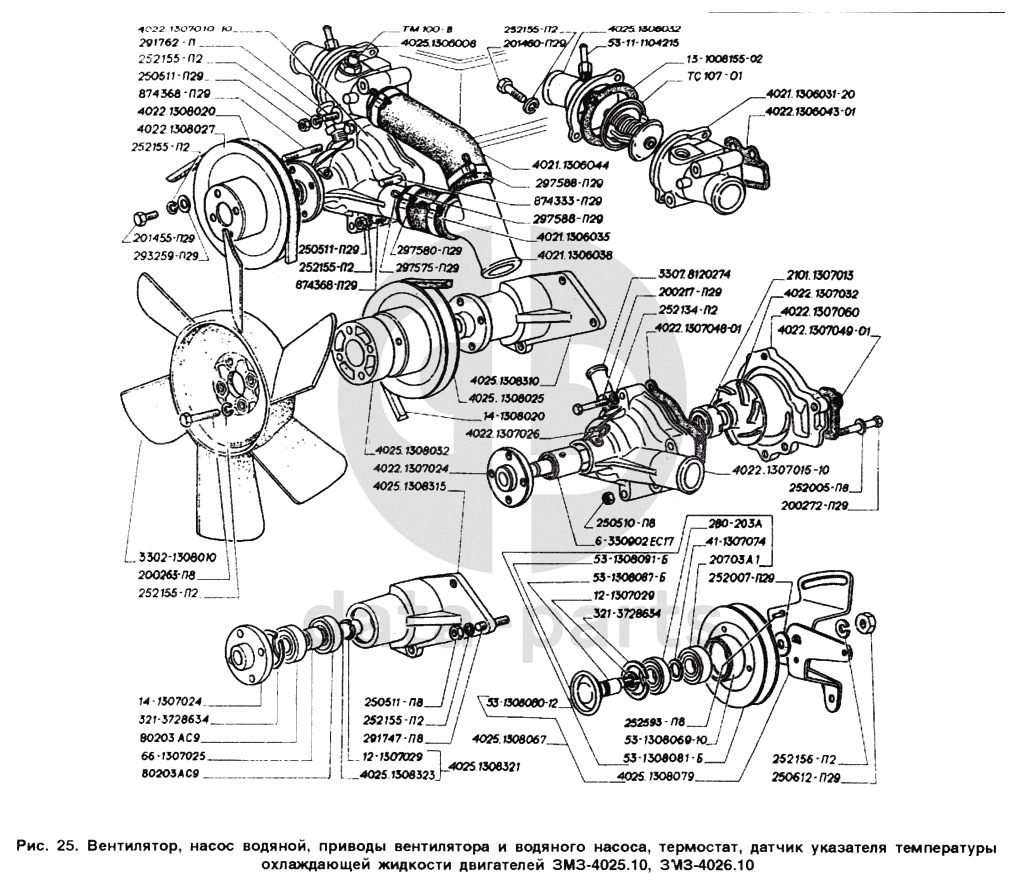 Вентилятор, насос водяной, приводы вентилятора и водяного насоса, термостат, датчик указателя температуры охлаждающей жидкости двигателей ЗМЗ-4025.10, ЗМЗ-4026.10 ГАЗ-2705 (ГАЗель)