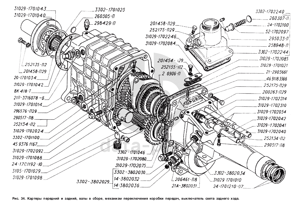 Картеры передний и задний, валы в сборе, механизм переключения коробки передач, выключатель света заднего хода ГАЗ-2705 (ГАЗель)