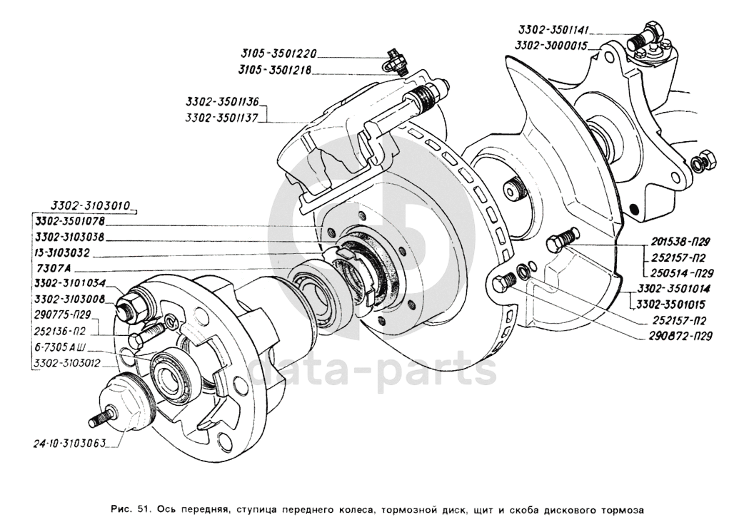 Ступица переднего колеса, тормозной диск, шит и скоба дискового тормоза, ось передняя ГАЗ-2705 (ГАЗель)