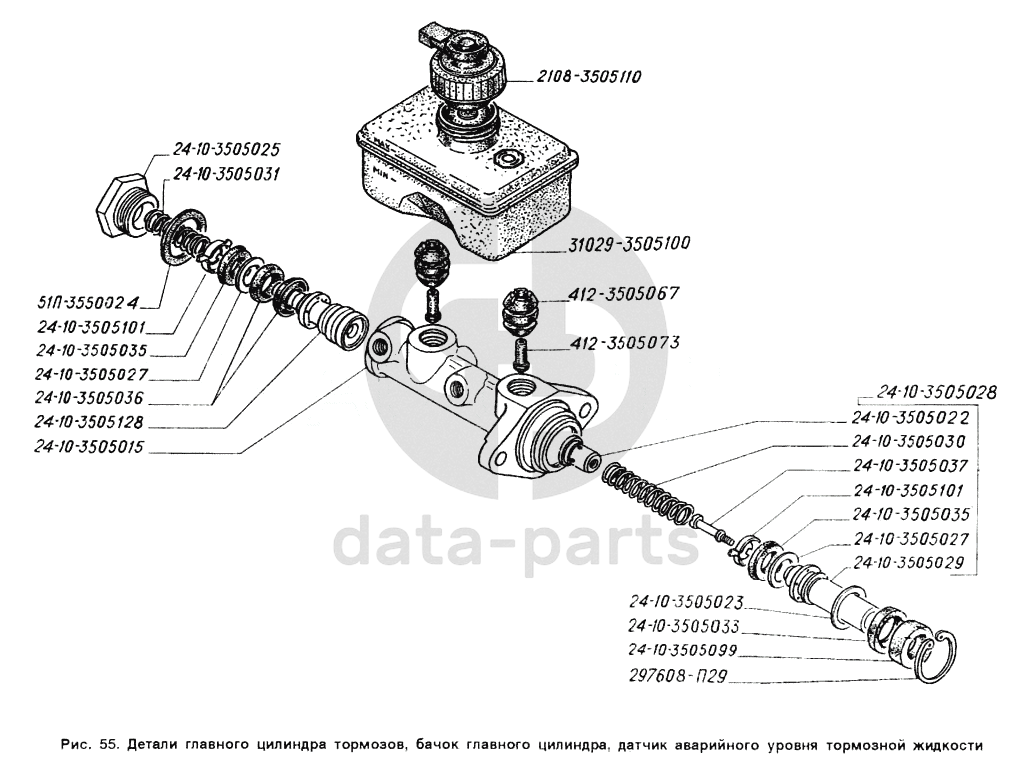 Детали главного цилиндра тормозов, бачок главного цилиндра, датчик аварийного уровня тормозной жидкости ГАЗ-2705 (ГАЗель)