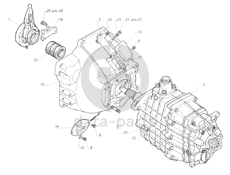 33081-1700004. Коробка передач с картером и механизмом управления сцепления ГАЗ-33081