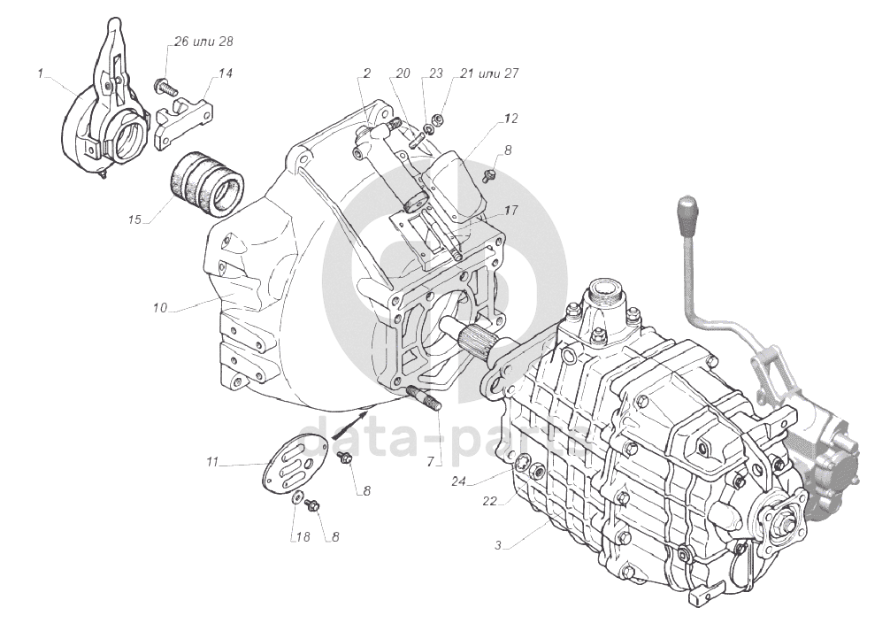 33081-1700004-10. Коробка передач с коробкой отбора мощности с картером и механизмом управления сцепления ГАЗ-33081