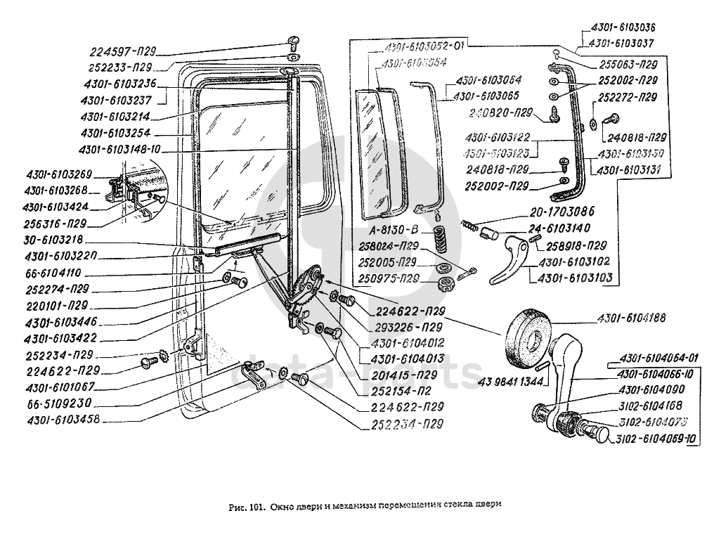 Окно двери и механизм перемещения стекла двери ГАЗ-4301