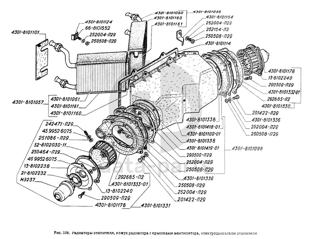 Радиаторы отопителя, кожух радиатора с крышками вентилятора, электродвигателя отопителя ГАЗ-4301