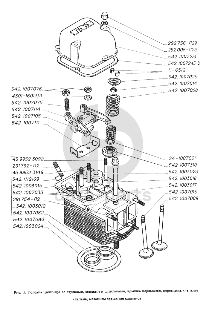 Головка цилиндра с втулками, седлами и шпильками, крышка коромысел, коромысла клапанов, клапана, механизм вращения клапанов ГАЗ-4301