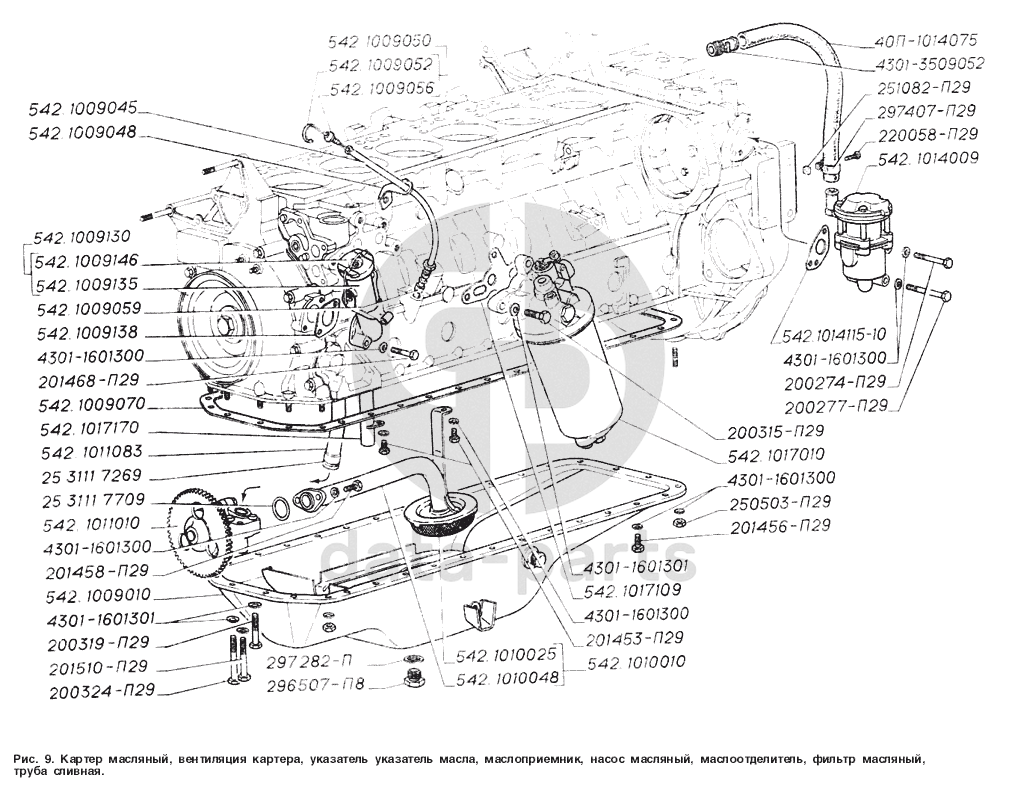 Картер масляный, вентиляция картера, указатель уровня масла, маслоприемник, насос масляный, маслоотделитель, фильтр масляный, труба сливная ГАЗ-4301