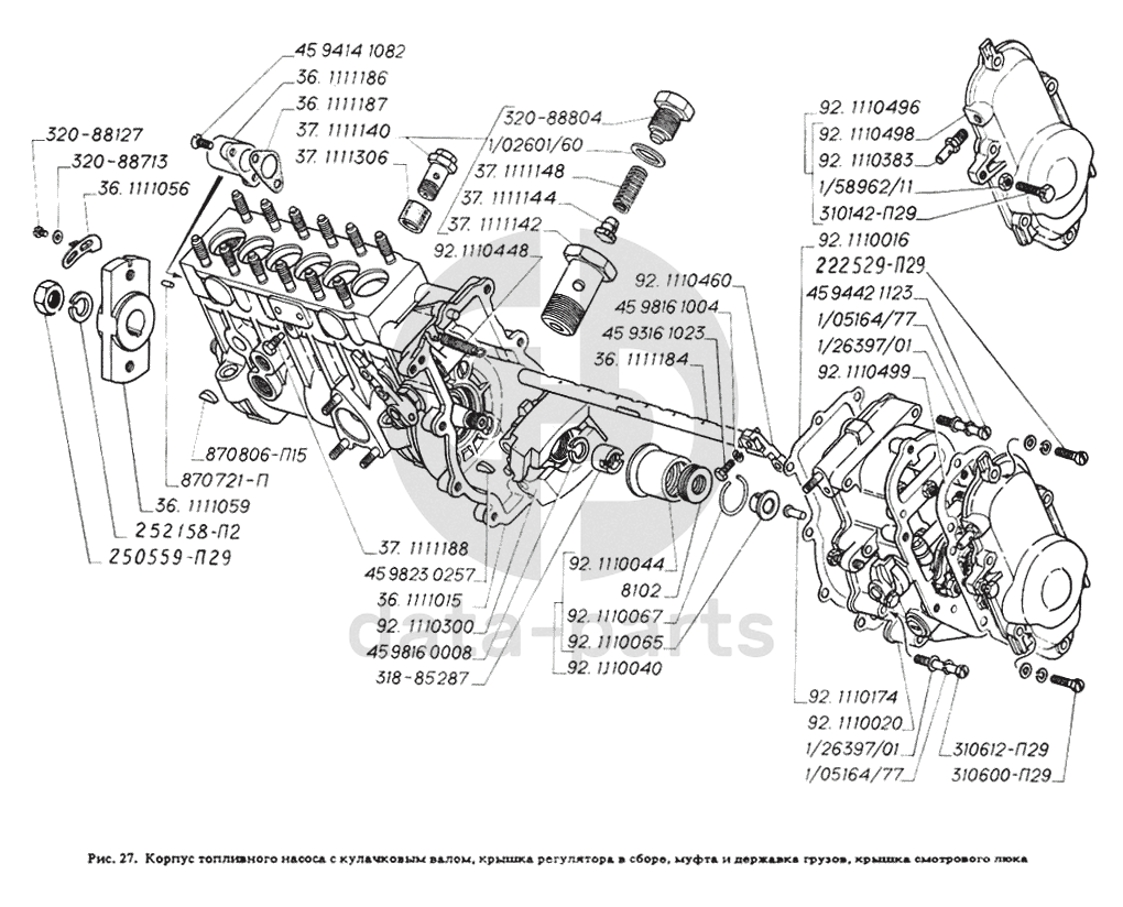 Корпус топливного насоса с кулачковым валом, крышка регулятора в сборе, муфта и державка грузов, крышка смотрового люка ГАЗ-4301
