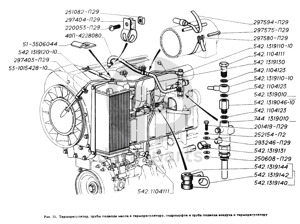 Терморегулятор, трубы подвода масла к терморегулятору, гидромуфте и труба подвода воздуха к терморегулятору ГАЗ-4301