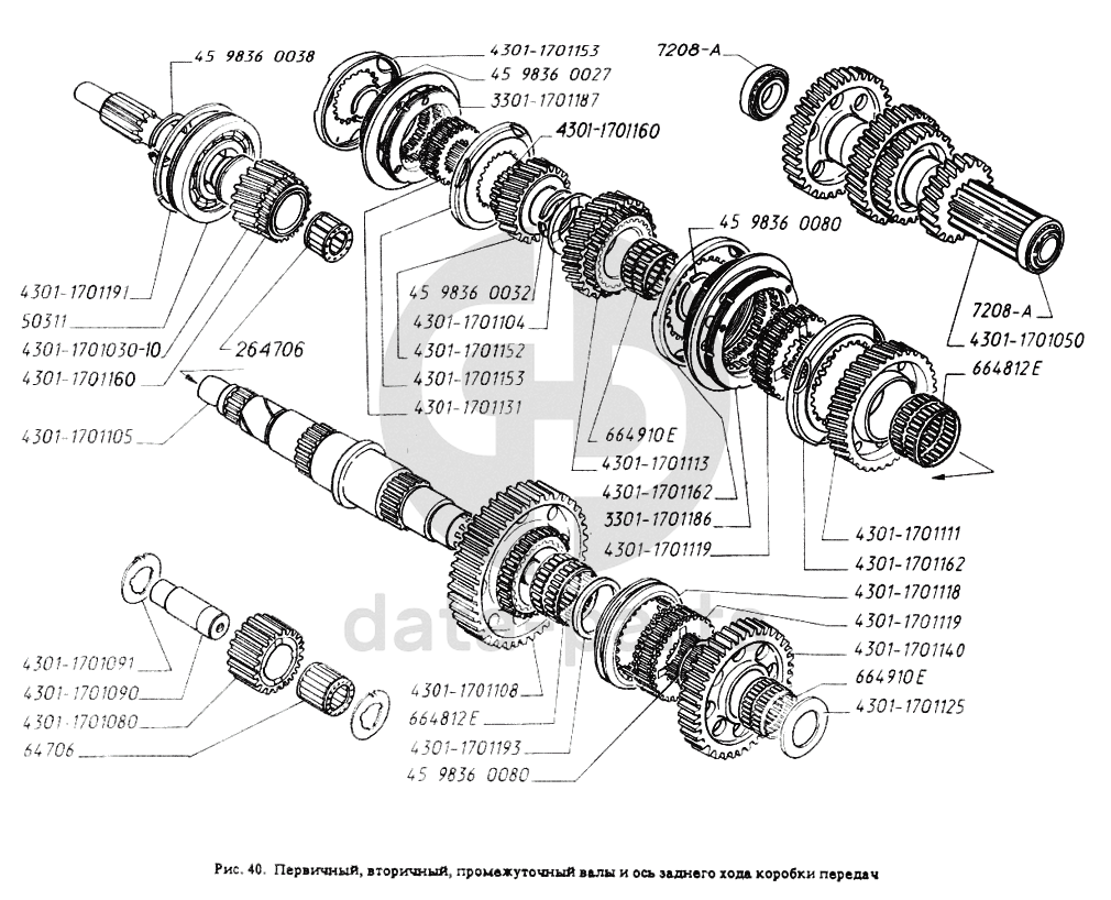 Первичный, вторичный, промежуточный валы и ось заднего хода коробки передач ГАЗ-4301