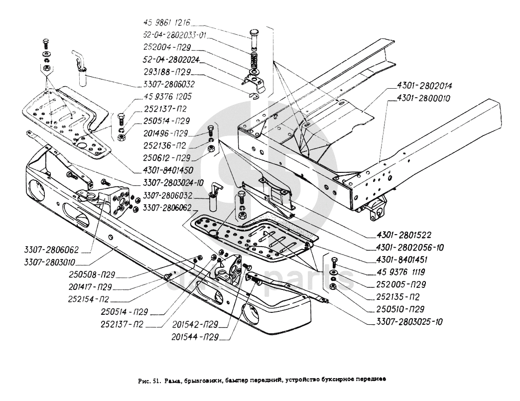 Рама, брызговики, бампер передний, устройство буксирное переднее ГАЗ-4301
