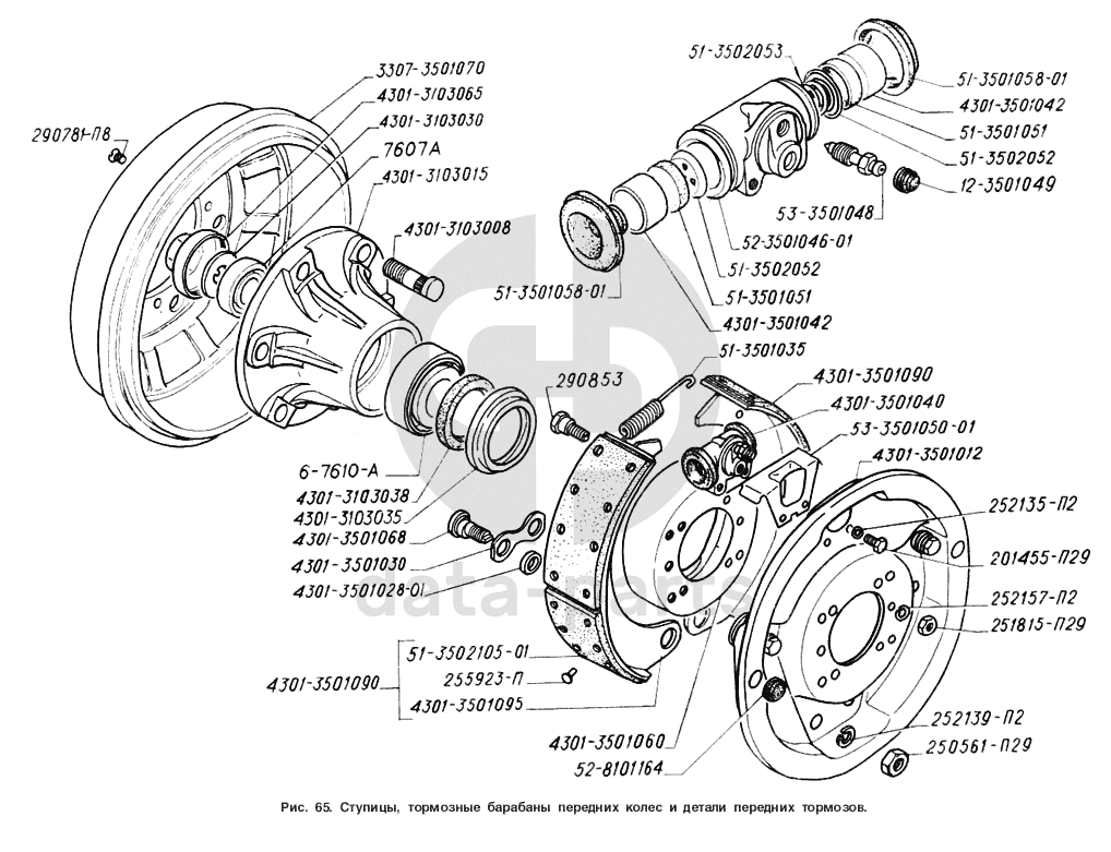 Ступицы, тормозные барабаны передних колес и детали передних тормозов ГАЗ-4301