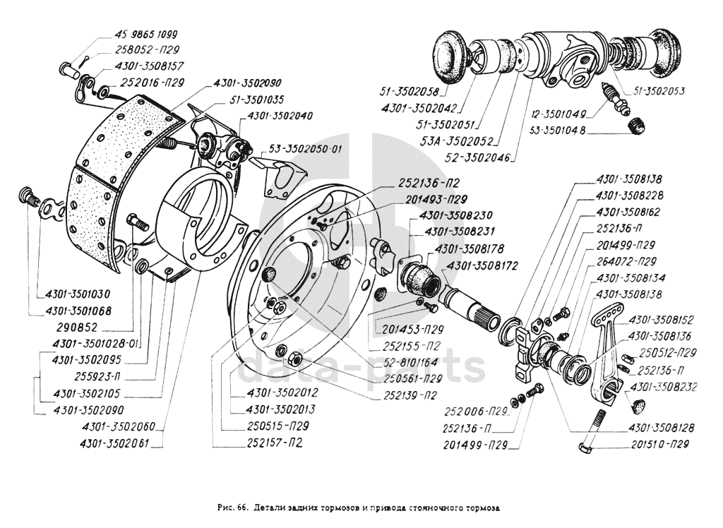 Детали задних тормозов и привода стояночного тормоза ГАЗ-4301