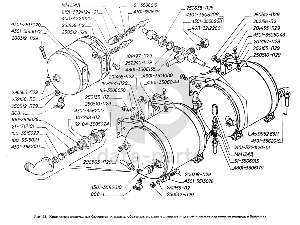 Крепление воздушных баллонов, клапаны обратные, краники сливные и датчики низкого давления воздуха в баллонах ГАЗ-4301