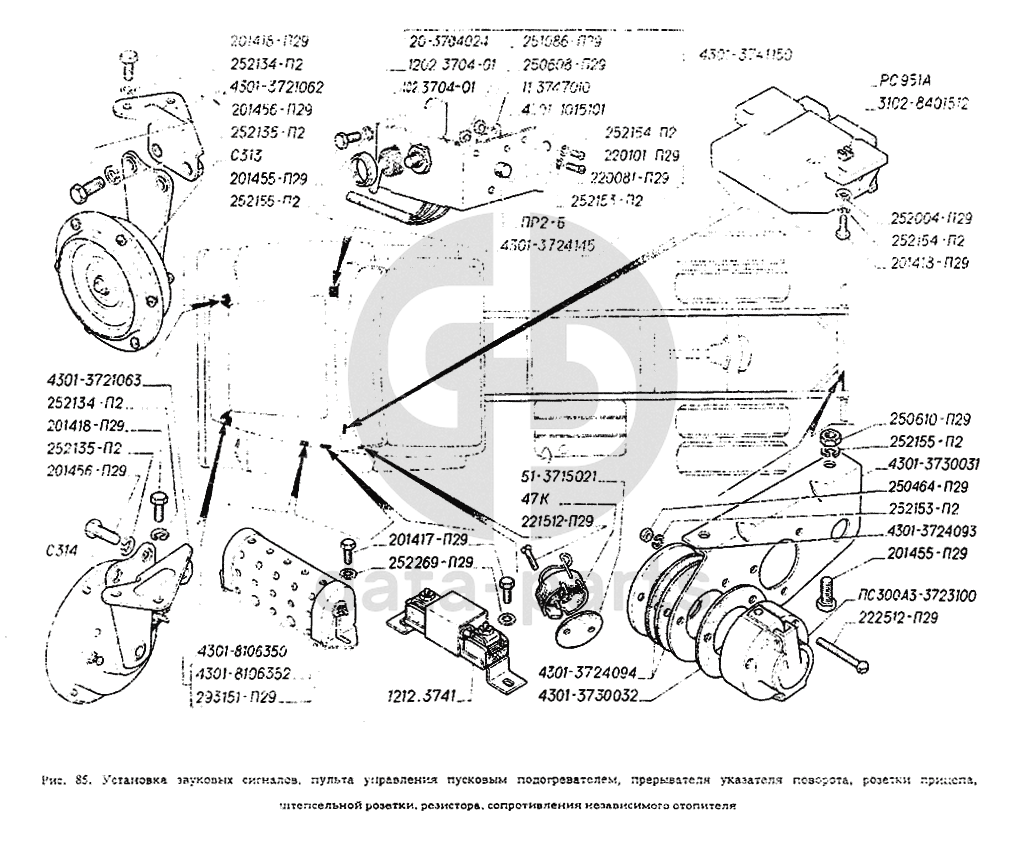Установка звуковых сигналов, пульта управления пусковым подогревателем прерывателя указателя поворота, розетки прицепа, штепсельной розетки, резистора, сопротивления независимого отопителя ГАЗ-4301