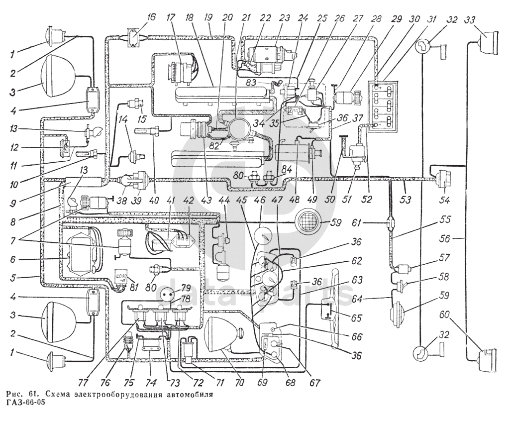 Схема электрооборудования автомобиля ГАЗ-66-05 ГАЗ-66