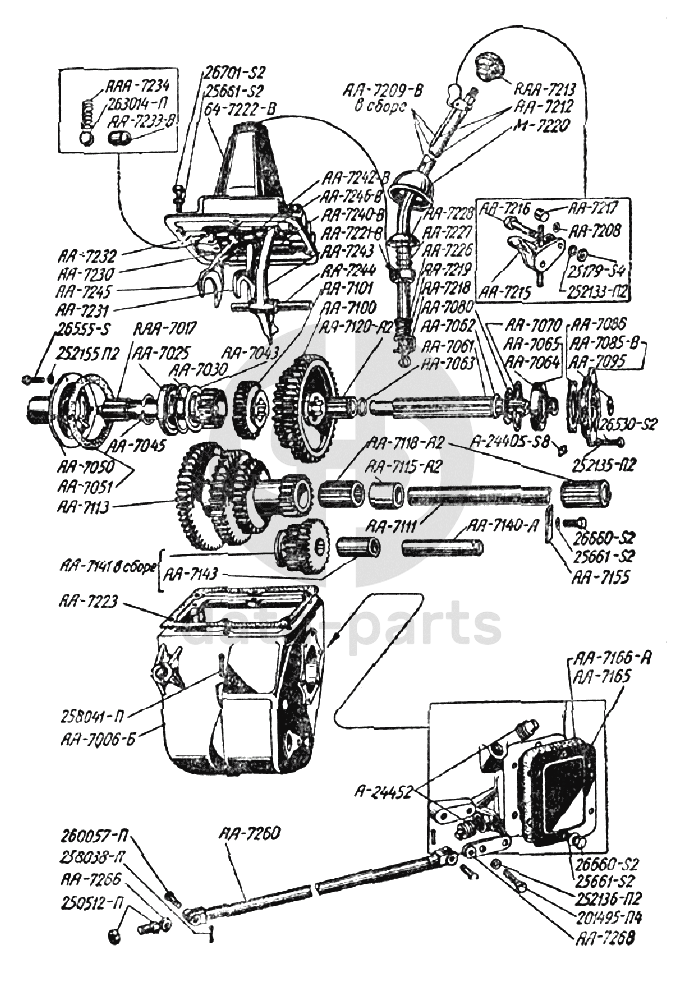 Коробка передач, механизм переключения передач, рычаг переключения передач, штанги реактивные ГАЗ-ММ "Полуторка"