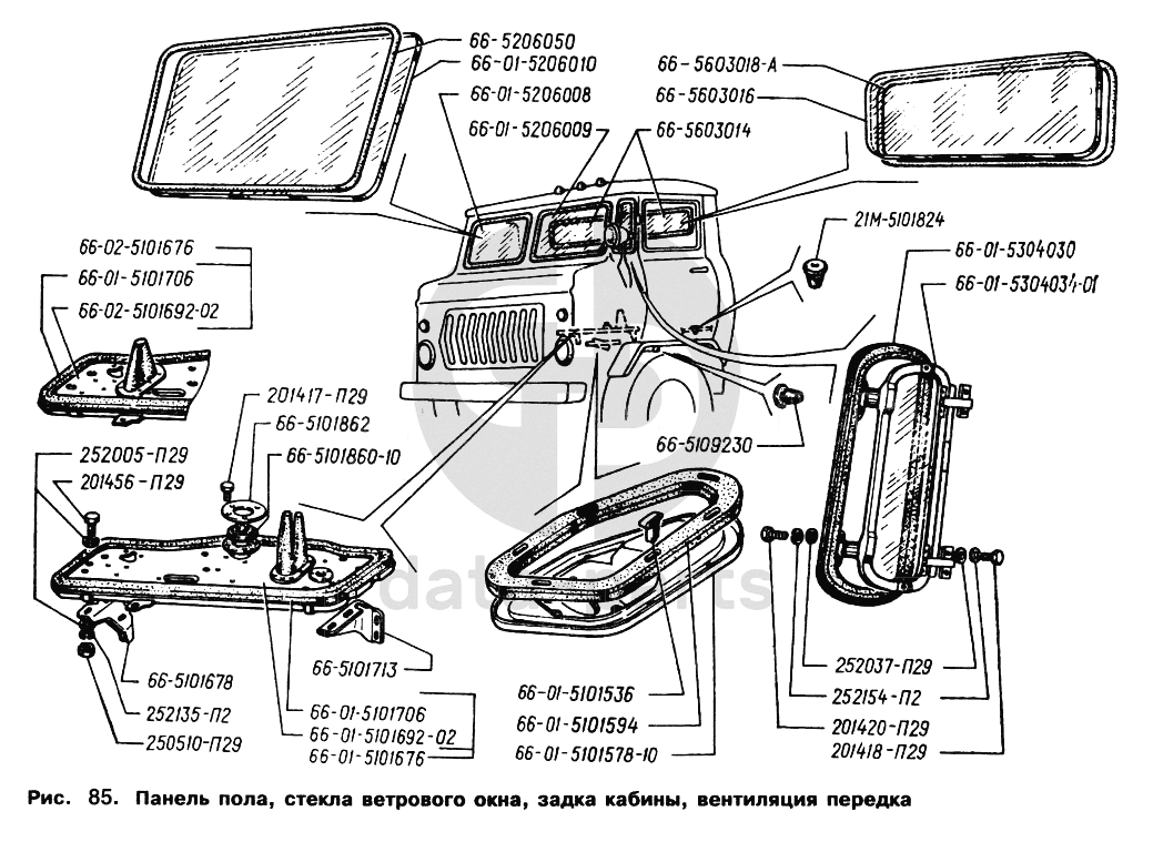 Панель пола, стекла ветрового окна, задка кабины, вентиляция передка ГАЗ-66