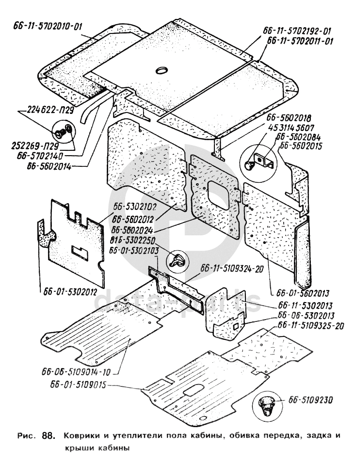 Коврики и утеплители пола кабины, обивка передка, задка и крыши кабины ГАЗ-66