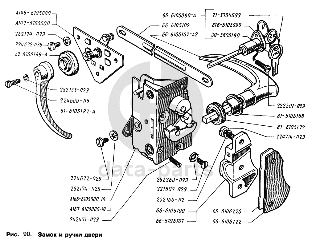 Замок двери левый в сборе (66-6105013-10), (66-50-6105013-10)