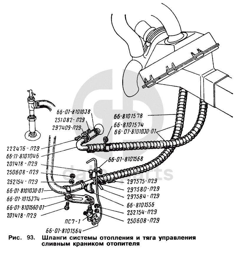 Шланги системы отопления и тяга управления сливным краником отопителя ГАЗ-66
